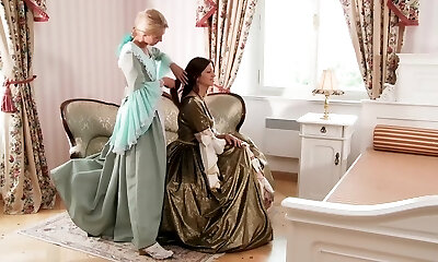 Three stunning lesbians in a castle get thrilled and then they bang on the throne chair