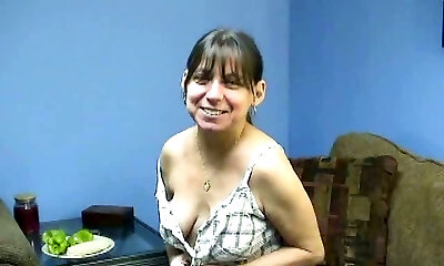 Ugly chubby MILF with saggy hooters masturbates with pepper and corn cob