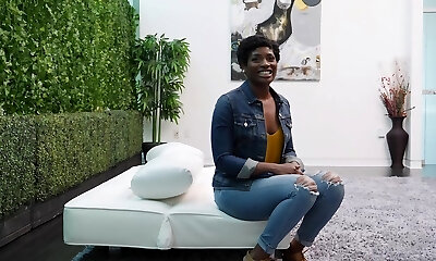 Blonde milf gets pussy punishment from young ebony stalion on couch