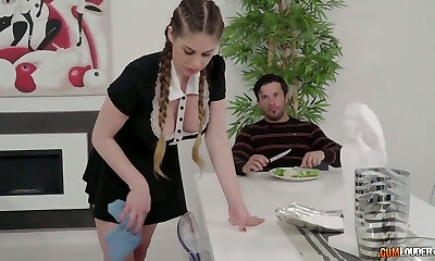 Super Hot busty maid with large boobs gets fucked in the kitchen by her client